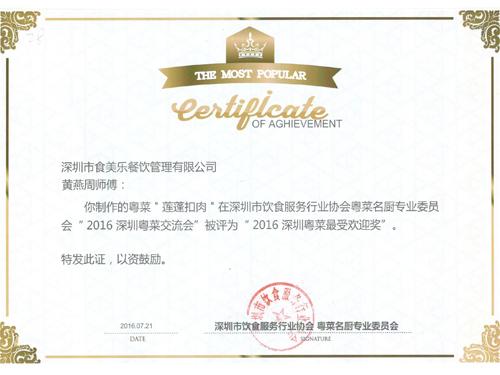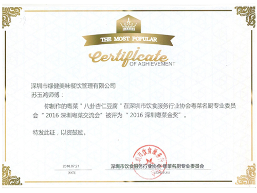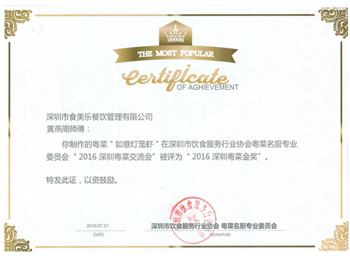 我司研發(fā)部丁總帶隊,攜大廚蘇玉洪、黃燕周參加了由深圳市飲食服務(wù)行業(yè)協(xié)會粵菜名廚專業(yè)委員會舉辦的“2016深圳粵菜交流會”。我司大廚蘇玉洪制作的"八卦杏仁豆腐"、黃燕周制作的“如意蝦燈”及“蓮蓬扣肉”被評為2016年深圳粵菜金獎。